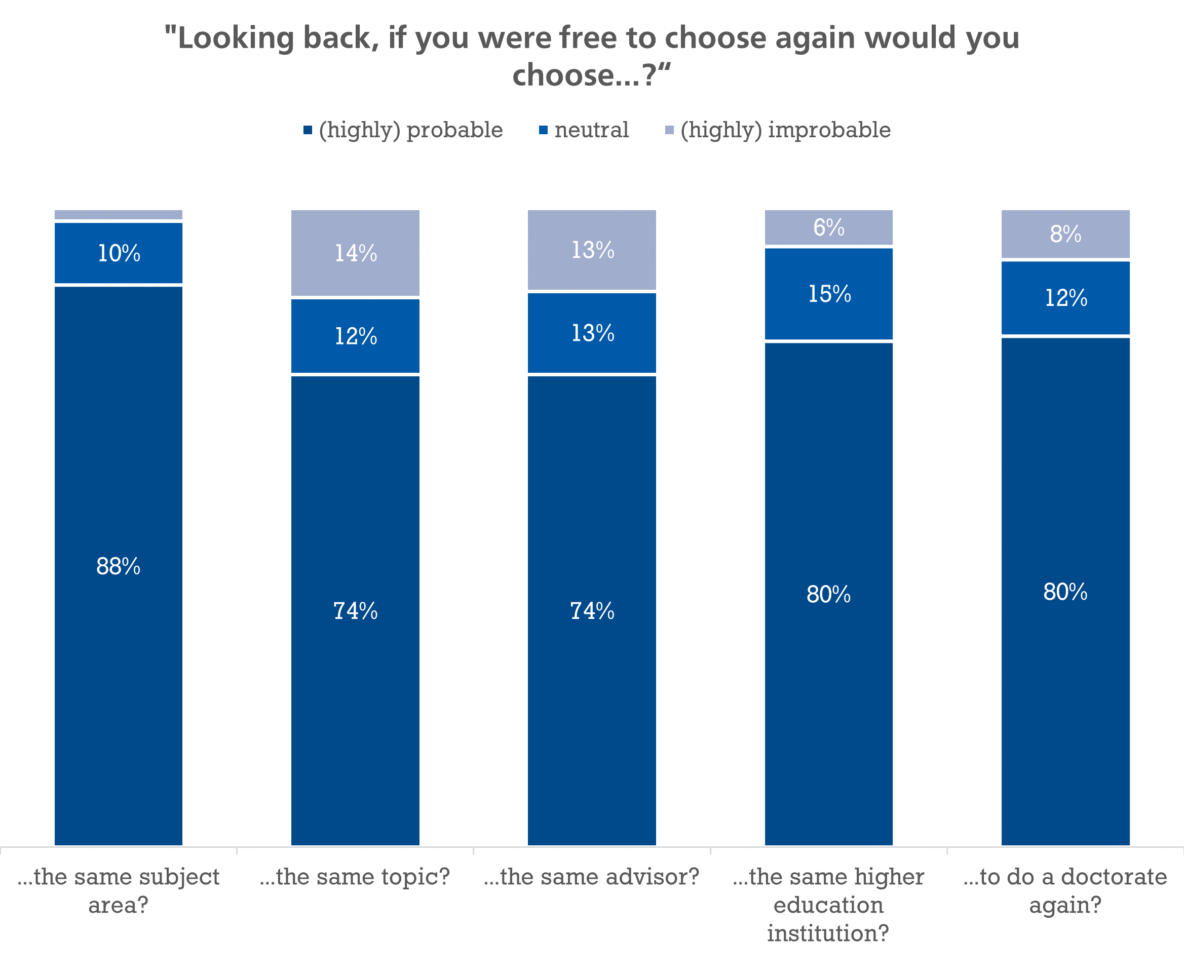 Given the choice again, what decisions would the Ph.D. graduates make regarding their doctorate? The vast majority would (highly) probably choose to do a doctorate again in the same subject area (88%) and at the TU Darmstadt (80%). The approval ratings for the same Ph.D. topic, for the general decision to do a doctorate as a continuation of the academic career and for the same advisor are also high.